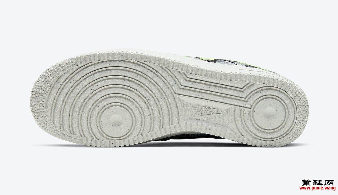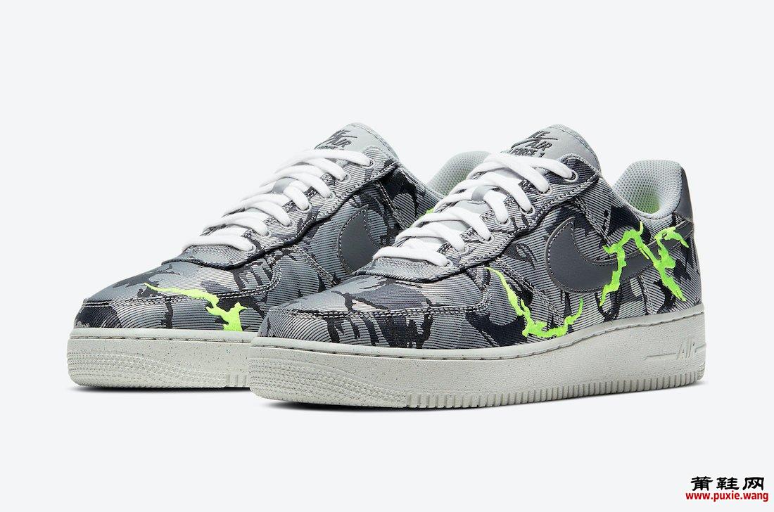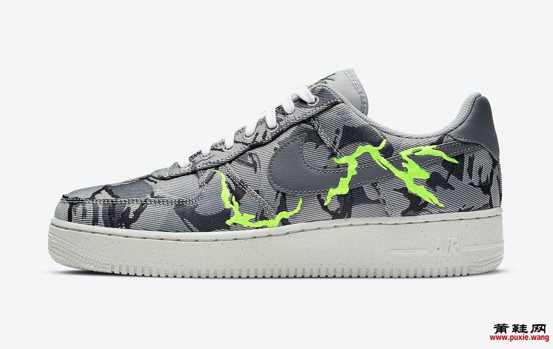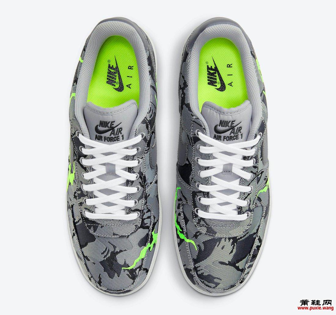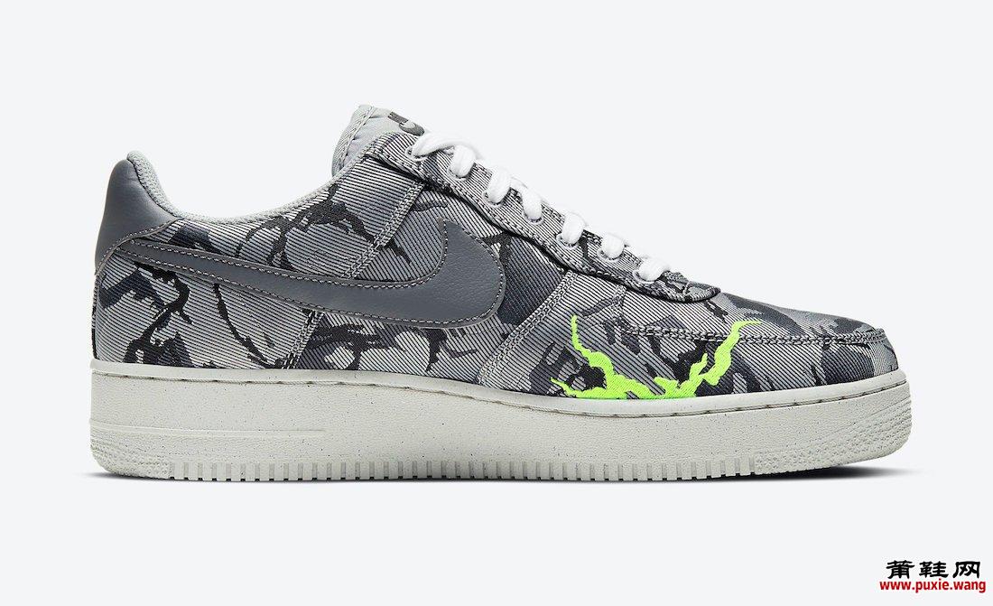 仔细看一下,这款Nike Air Force 1 Low穿着浅烟灰色和烟灰色配色。此外,它的鞋帮上带有灰色迷彩,侧面有条纹的鲜绿色刺绣。此外,Solid Gray出现在皮革的Swoosh和鞋跟扣上。白色鞋带,鞋垫绿色,鞋底有斑点。