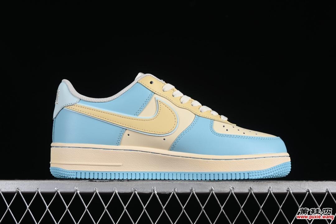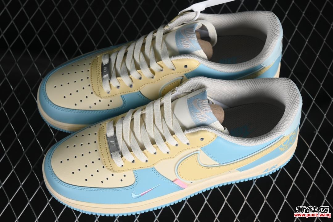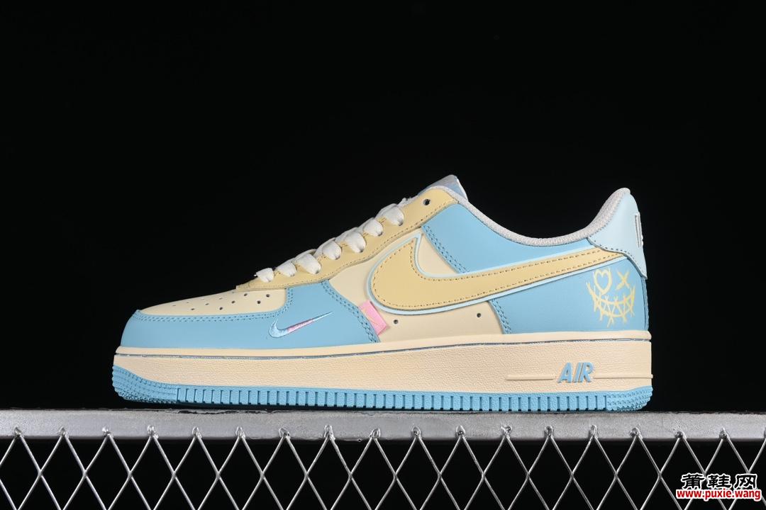 Nike Air Force 1’07 Low “Piemon” 小丑皇 空军一号低帮定制休闲板鞋 XL2312-555 #鞋身浅黄加蓝色搭配 恶搞笑脸图案 专注外贸渠道 全掌内置蜂窝气垫 原盒配件 原厂中底钢印、拉帮完美 尺码:36 36.5 37.5 38 38.5 39 40 40.5 41 42 42.5 43 44 44.5 45