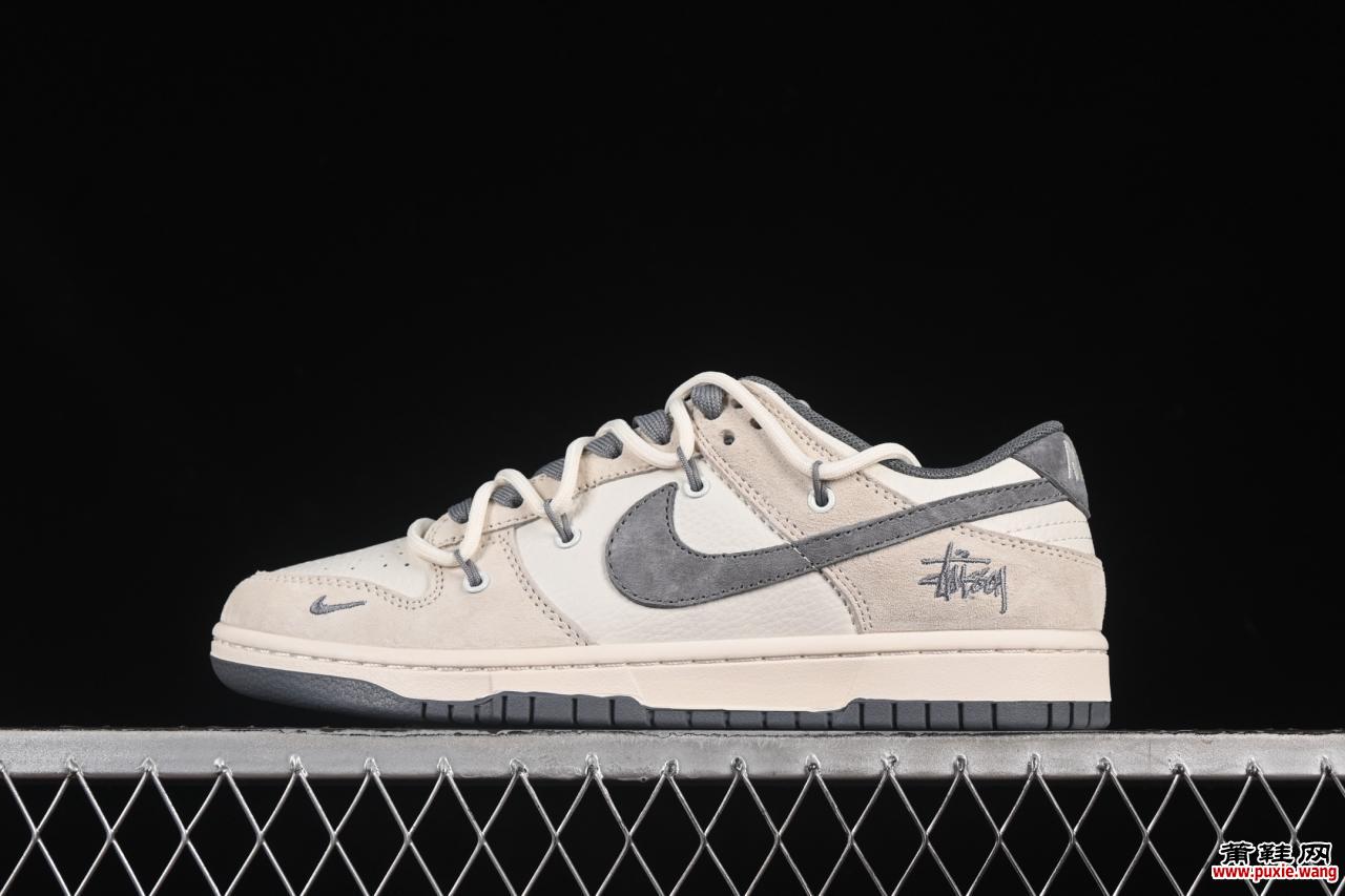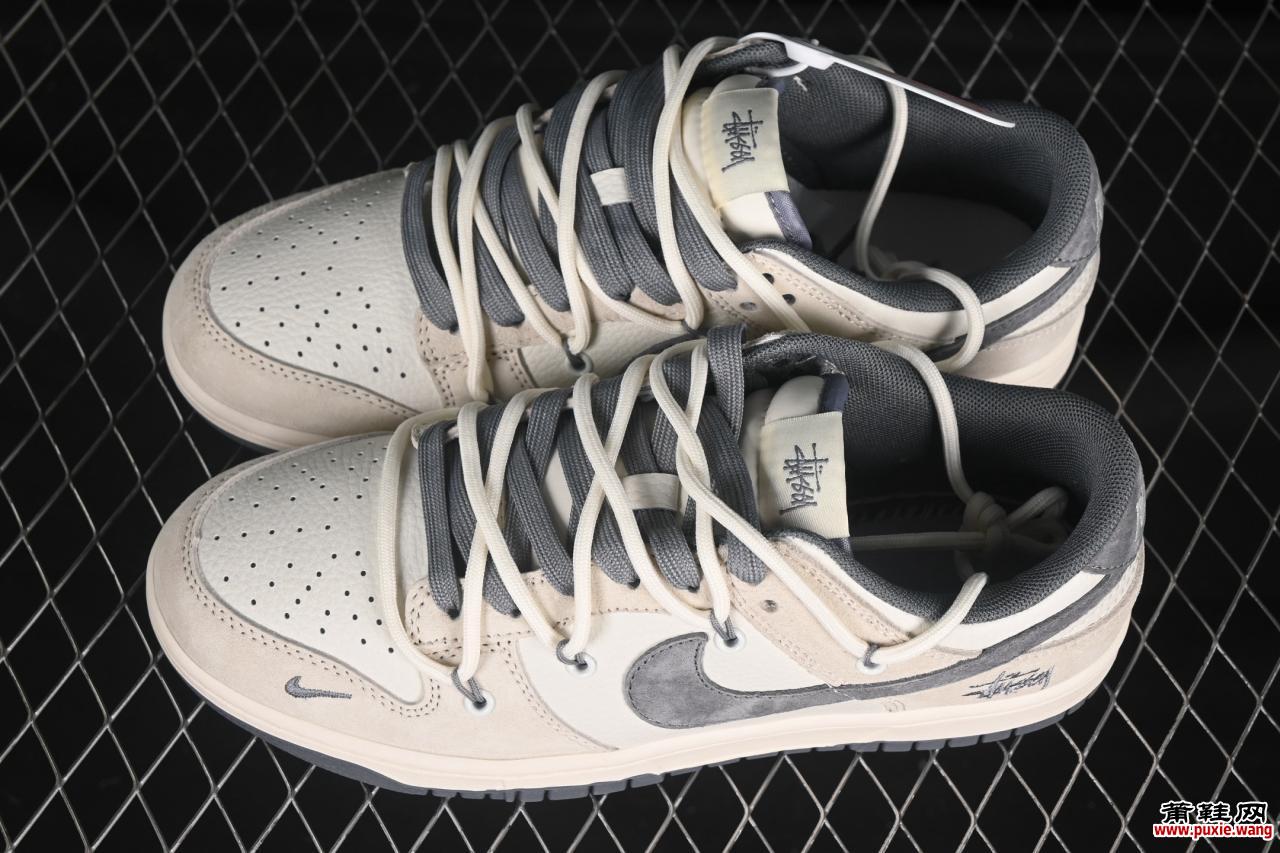 Nike SB Dunk Low与街头品牌Stüssy联名推出的 绑带猪八灰勾定制款(DM6868-093) ,凭借限量发售策略大厂纯原品质工艺,成为2023年板鞋市场的焦点单品。本文从设计基因、工艺标准、适配场景及收藏价值四大维度,解析其核心卖点。