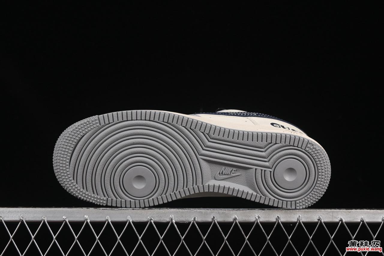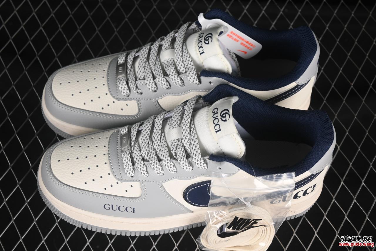 Nike Air Force 1’07 Low与奢侈品牌古驰(Gucci)联名的 「灰蓝勾」特别款(XS1958-543) ,以原厂级工艺标准与定制化设计语言,重新定义高端街头板鞋的边界。本文从设计亮点、工艺配置、适配场景及收藏潜力四大维度,解析其核心价值。