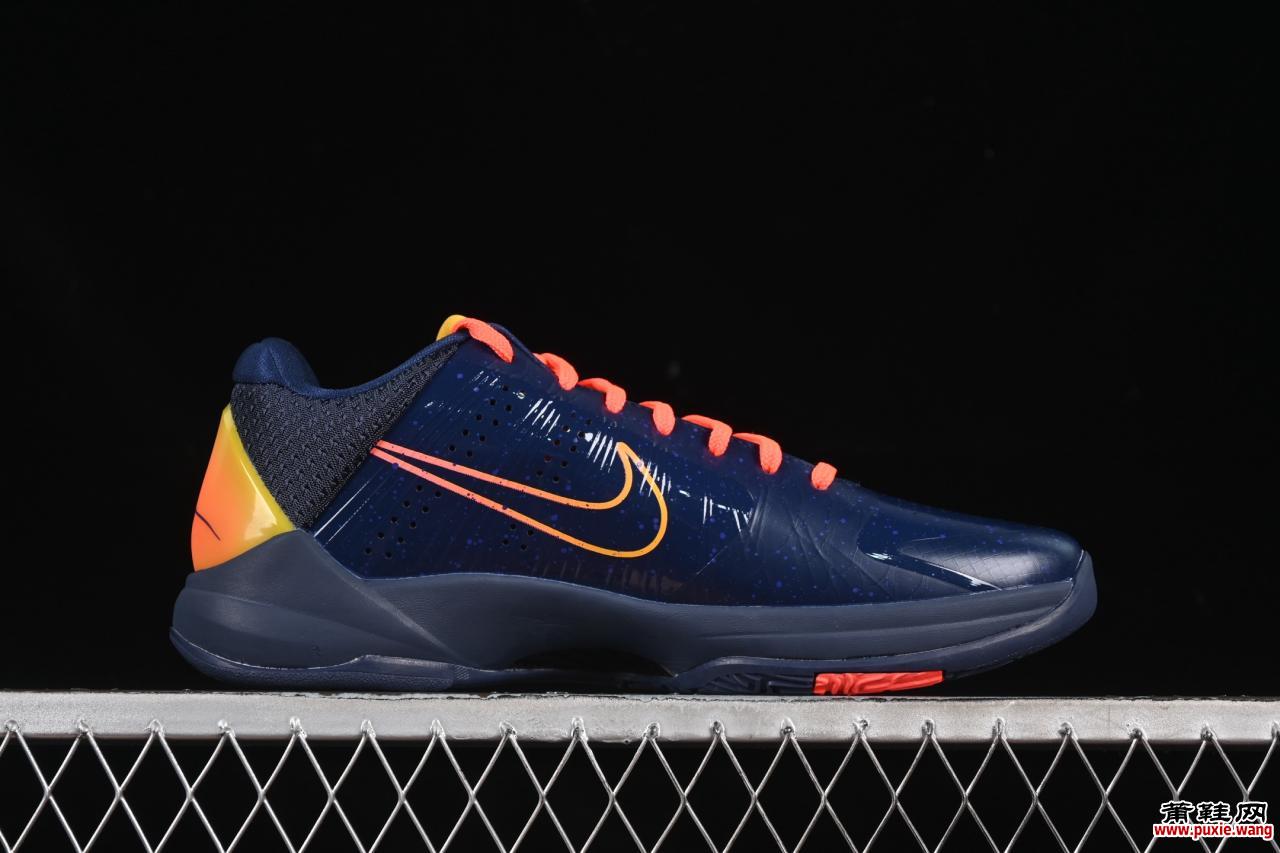 鞋面采用 午夜蓝主调,侧身Swoosh以 渐变粉橙勾边 呼应印第安纳狂热队客场球衣,后跟烫印 科比金色签名 致敬曼巴精神。 - 硬核工艺: