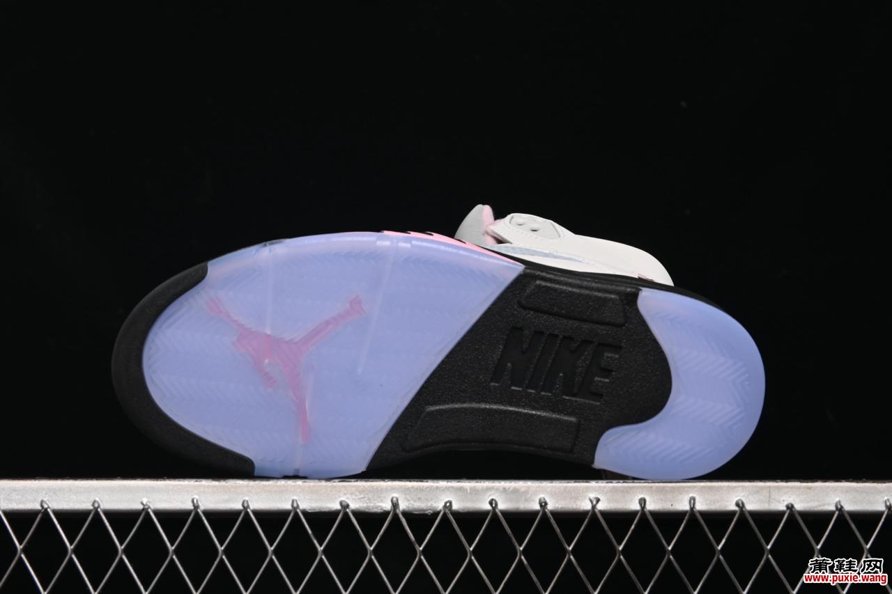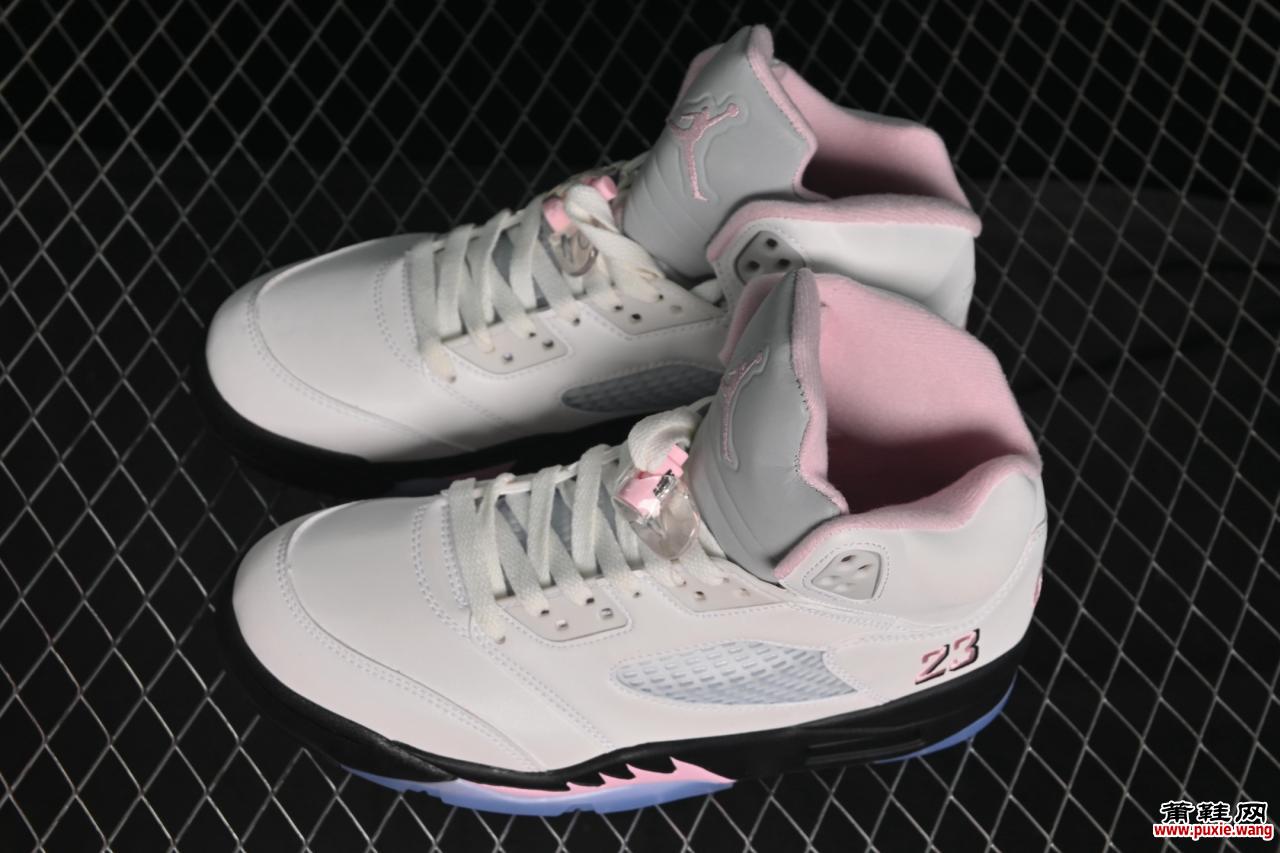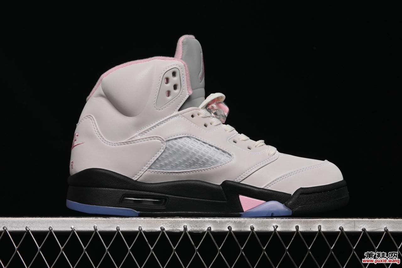 Air Jordan 5 Retro “35th Anniversary” AJ5 乔5少女粉(货号:HQ7978-102)是为纪念该经典鞋型诞生35周年推出的特别配色。鞋身主体采用纯净白色皮革打造,搭配荔枝纹质感提升视觉层次,而中底、鞋带扣及内衬等细节以柔和的樱花粉色点缀,营造出清新甜美的少女气息。标志性设计元素包括:鞋舌搭载3M反光材质,在暗光环境下呈现炫目视觉效果;侧边透明天网设计源自二战野马战斗机灵感,鲨鱼齿纹路中底则延续了AJ5的经典攻击性美学。